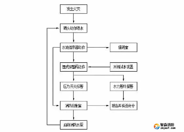 當(dāng)發(fā)生火災(zāi)時(shí),灑水噴頭的感溫元件自動(dòng)脫落,并開始向保護(hù)區(qū)灑水,由于系統(tǒng)內(nèi)的水由原來的相對(duì)靜止?fàn)顟B(tài),變?yōu)榱鲃?dòng)狀態(tài),水流指示器感應(yīng)并送出信號(hào),造成濕式報(bào)警閥的上下部的水壓差,從而開啟閥片,使供水管路暢通。根據(jù)水流指示器和壓力開關(guān)的信號(hào),控制器啟動(dòng)消防水泵向管網(wǎng)加壓供水,達(dá)到持續(xù)自動(dòng)噴水滅火的作用。其工作原理如下圖: