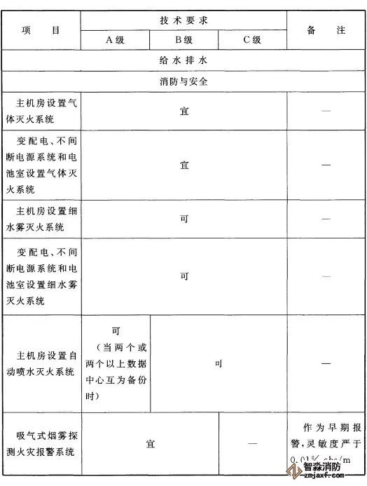 2、A級數據中心的主機房宜設置氣體滅火系統,也可設置細水霧滅火系統。當A級數據中心內的電子信息系統在其他數據中心內安裝有承擔相同功能的備份系統時,也可設置自動噴水滅火系統。
