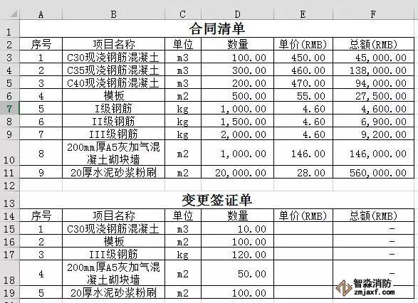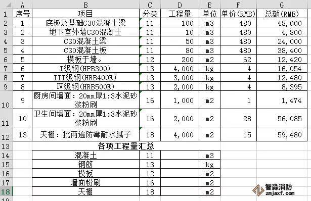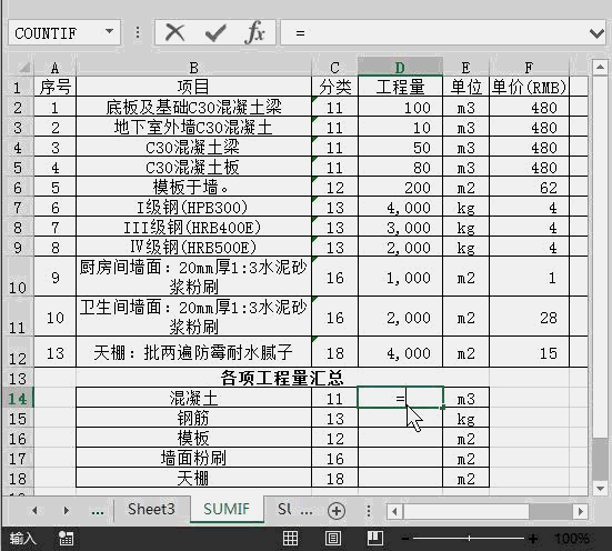 請注意,需要將各項工程量進行分類(如11、12……)。筆者再解釋下單元格D14的公式“=SUMIF($C$2:$C$12,C14,$D$2:$D$12)”:第一個參數(shù)“$C$2:$C$12”和第三個參數(shù)”$D$2:$D$12“必須保持單元格行數(shù)對應。比如本案例中"分類"列的起始行數(shù)為2,"工程量"列的起始行數(shù)也必須為2。同樣,"分類"列的結束行數(shù)為12,"工程量"列的結束行數(shù)也必須為12。另外,這兩個參數(shù)必須用”$”鎖定單元格,這么做是為了方便后期批量復制單元格的時候分類匯總數(shù)據(jù)不會隨粘貼單元格位置的不同而變化。
