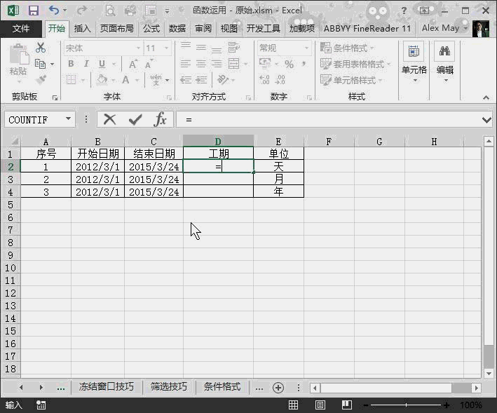筆者先簡單解釋下以下表格中的單元格D2輸入的公式“=DATEDIF(B2,C2,"d")“前兩個參數(shù)分別是開始日期和結束日期,第三個參數(shù)"d"是計算天數(shù)的參數(shù),也可以改成"m"(計算月份)和"y"(計算年份)。
