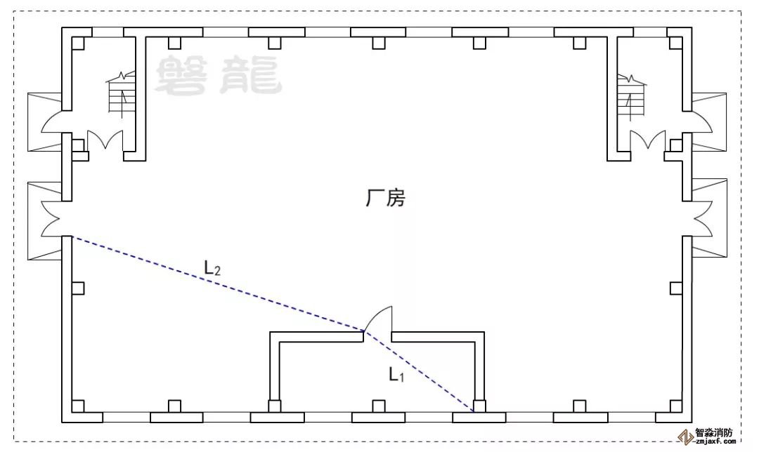 2、廠房倉庫同樣不應(yīng)采用嵌套(穿套)設(shè)置的方式,確因功能需要,嵌套(穿套)設(shè)置的房間不應(yīng)超過一級(jí),疏散距離應(yīng)按人員行走的直線距離計(jì)算,在圖示6的廠房中,示例房間內(nèi)任一點(diǎn)至安全出口的直線距離,應(yīng)為L(zhǎng)1+L2。