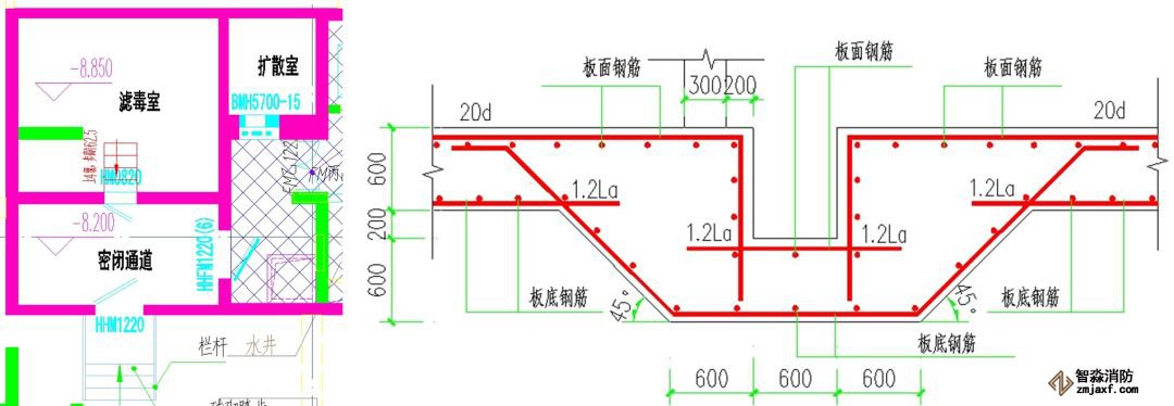 4、非防護區無關管道不得穿越頂板,一般是上部防爆波地漏、消防管道、與人防相關的給排水管道才允許穿越。