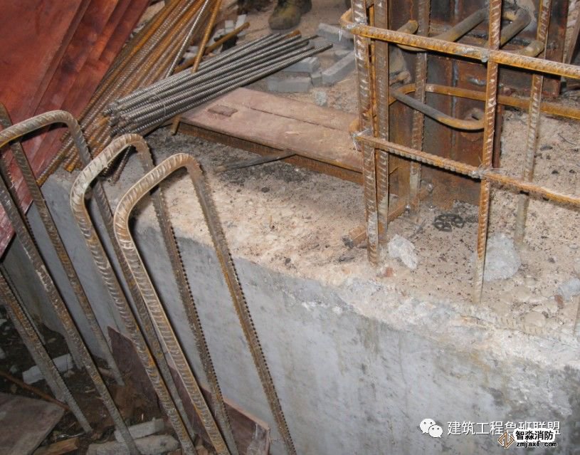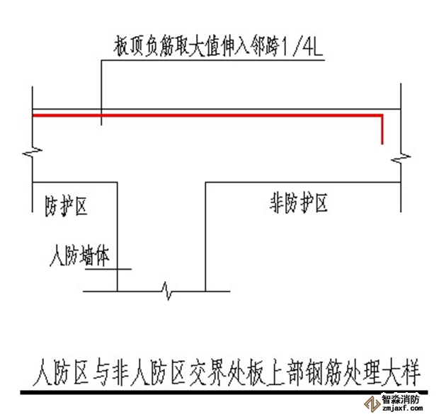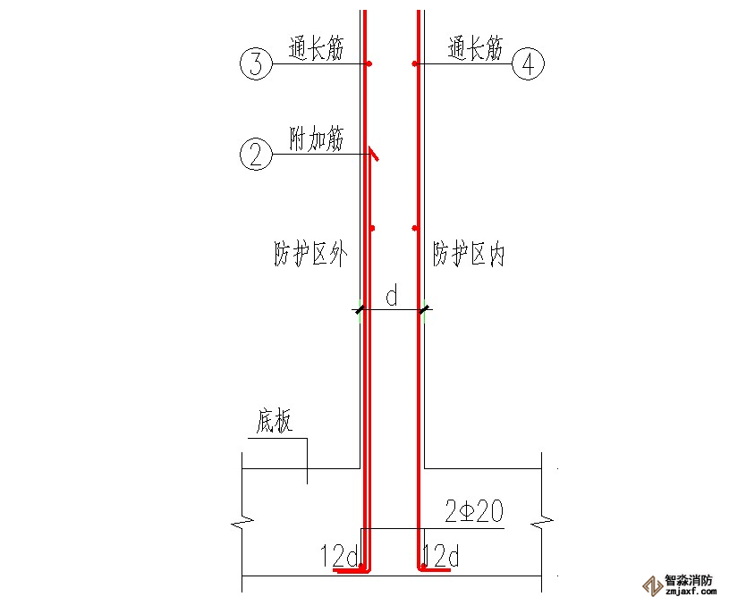 人防墻體鋼筋:豎向鋼筋應伸至板頂部,未滿足者,應加插倒U形鋼筋,鋼筋規格同原設計,長度為搭接長度Lld。