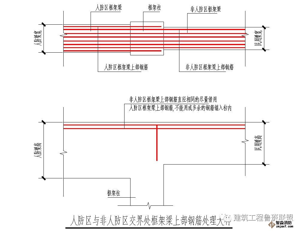 1)人防區內梁板配筋圖紙一般由人防院設計,但模板關系(如洞口定位,梁定位、標高)由民用院模板圖表達,所以梁板配筋應結合兩院圖紙施工。