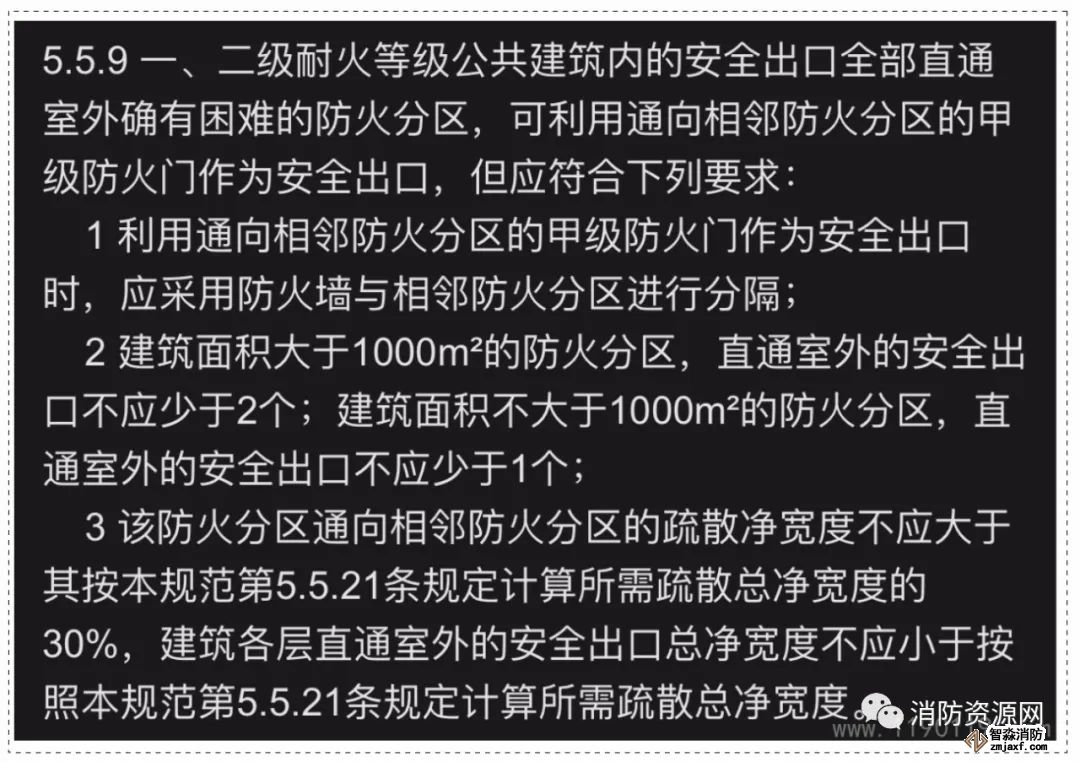1、耐火等級為一級或二級的公共建筑,相鄰布置的防火分區(qū),如某防火分區(qū)的安全出口全部直通室外確有困難,可利用防火墻上通向相鄰防火分區(qū)的甲級防火門,作為安全出口,詳見《建規(guī)》5.5.9: