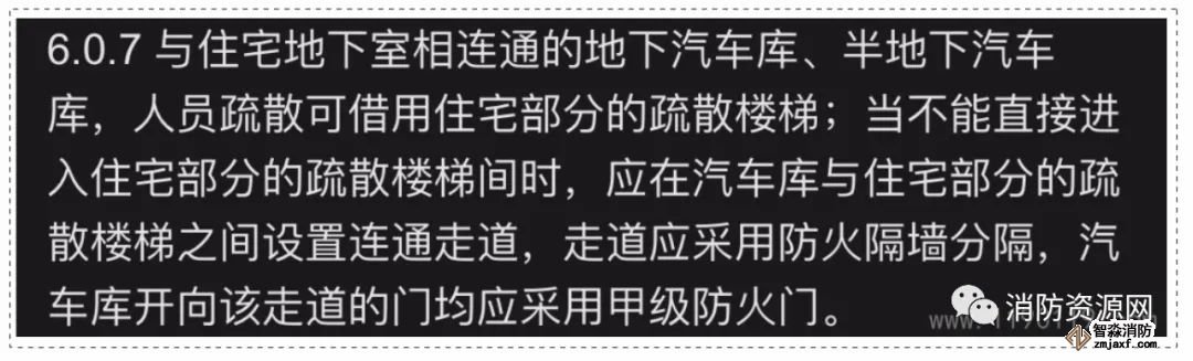 3、與住宅地下室相連通的地下汽車庫(或半地下汽車庫),汽車庫的人員疏散,可借用住宅部分的疏散樓梯,詳見《 汽車庫、修車庫、停車場設(shè)計防火規(guī)范》6.0.7: