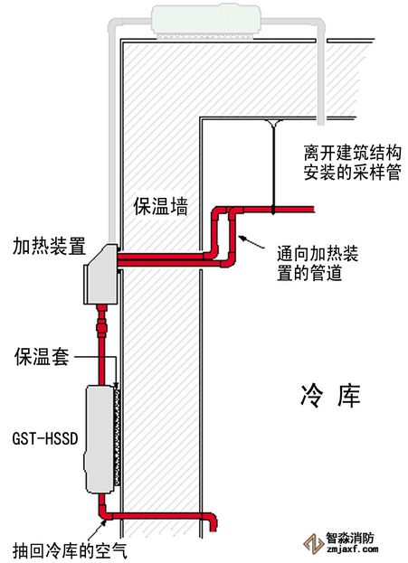 冷庫中采樣管,加熱箱和吸氣式感煙火災探測器的相對位置