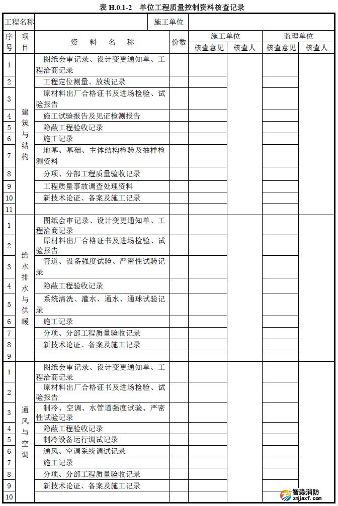 單位工程質量竣工驗收記錄、質量控制資料核查記錄、安全和功能檢驗資料核查及主要功能抽查記錄、觀感質量檢查記錄應按《建筑工程施工質量驗收統一標準》附錄H填寫。