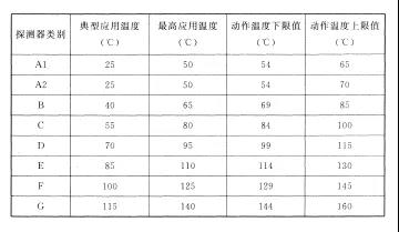 注:表中A1、A2、B、C、D、E、F、G為點型感溫探測器的不同類別,其具體參數應符合附錄一的規定。