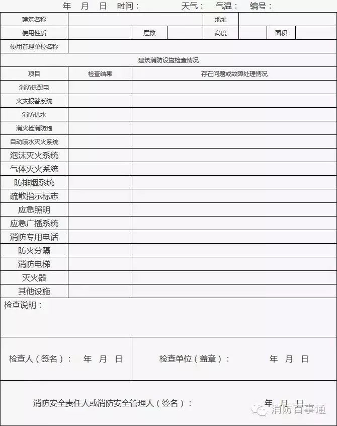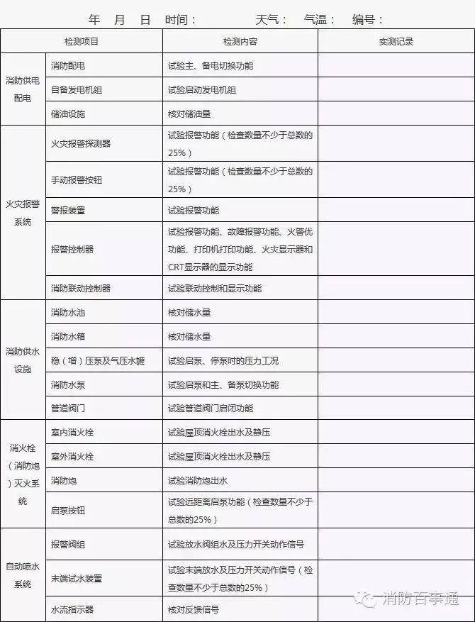 2、發現的問題或存在故障應在“實測記錄”欄中填寫,并及時處置;當場不能處置的要填報《建筑消防設施故障處理登記表》;