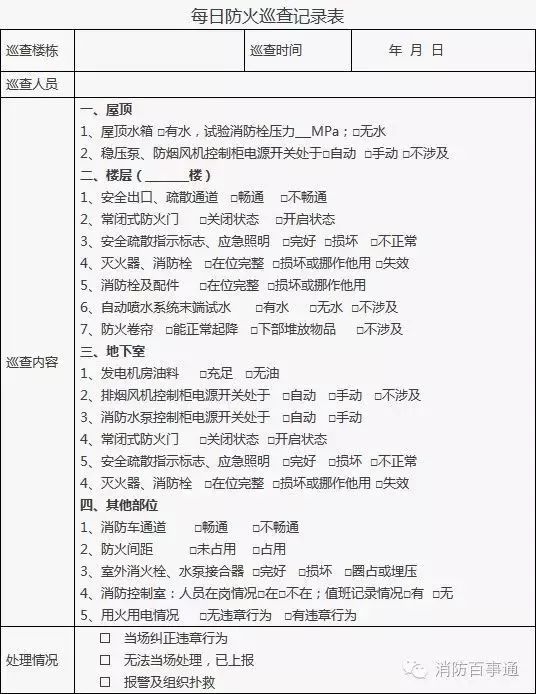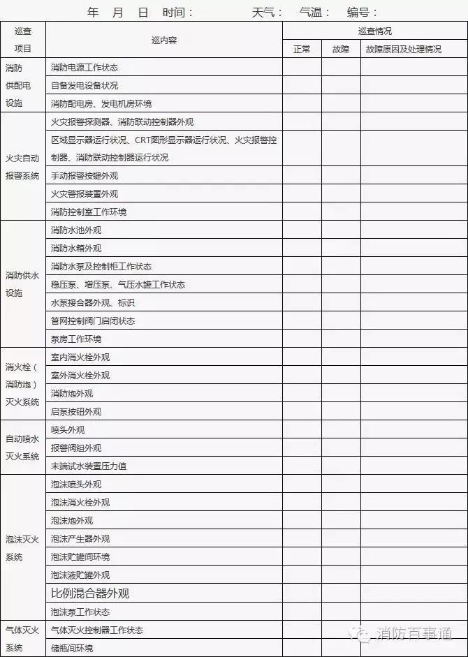1、建筑消防設施巡查應明確各類建筑消防設施巡查部位,巡查應當每周至少一次,并填表。依法開展每月防火巡查的單位和設有電子巡查更系統的單位,應將建筑消防設施巡查部位納入其中。