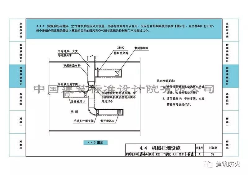 4、第98頁(yè)的“4.4.3圖示”中排煙支管上增加了“280℃排煙防火閥”,刪除了“風(fēng)口控制要求”中“常閉排煙口”280℃自動(dòng)關(guān)閉的字樣。