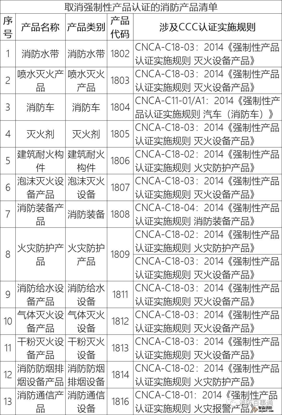 1、自即日起,我中心不再受理消防水帶、噴水滅火產品、消防車、滅火劑、建筑耐火構件、泡沫滅火設備產品、消防裝備產品、火災防護產品、消防給水設備產品、氣體滅火設備產品、干粉滅火設備產品、消防防煙排煙設備產品、消防通信產品和部分火災報警產品(線型感溫火災探測器產品、消防聯動控制系統產品、防火卷簾控制器產品和城市消防遠程監控產品)的強制性產品認證委托,統一注銷涉及上述產品的強制性產品認證證書,中止正在認證過程中的涉及上述產品的強制性產品認證工作。