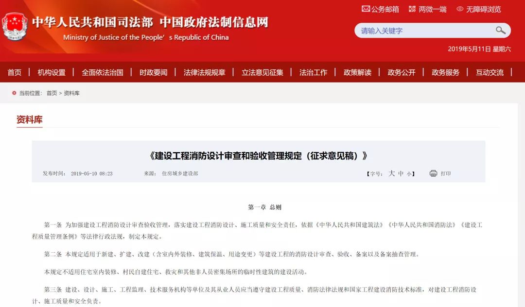 2019年5月10日,中國政府法制信息網發布:住房和城鄉建設部關于《建設工程消防設計審查和驗收管理規定(征求意見稿)》公開征求意見的通知。