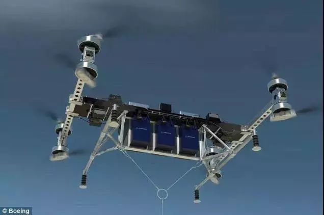 這架無人機(jī)可以承載兩頭小象的重量。這艘飛機(jī)重達(dá)339公斤(747磅),但還能攜帶226公斤(500磅)的貨物。波音公司表示,它可能會(huì)利用無人機(jī)在未來轉(zhuǎn)移重型貨物。這個(gè)身形矯健的無人機(jī)長4.6米(15英尺),寬5.5米(18英尺),高1.2米(4英尺)。從圖中可以看出,它有8個(gè)跟直升機(jī)一樣的旋翼,可以垂直起降。它是由電力推進(jìn)系統(tǒng)驅(qū)動(dòng)的。需要運(yùn)輸?shù)呢浳?,可以用電纜連接到無人機(jī)上。