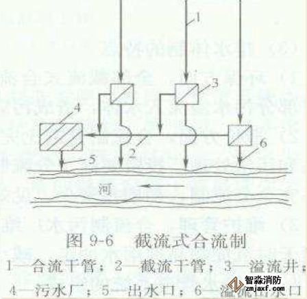 臨河岸邊建造一條截流干渠,同時在合流干管與截流干管相交前或相交處設置溢流井,并在截留干管下游設置污水廠。晴天和初降雨時所有污水都排送至污水廠,經處理后排入水體,隨著降雨量的增加,雨水徑流也增加,就有部分混合污水經溢流井溢出,直接排入水體。