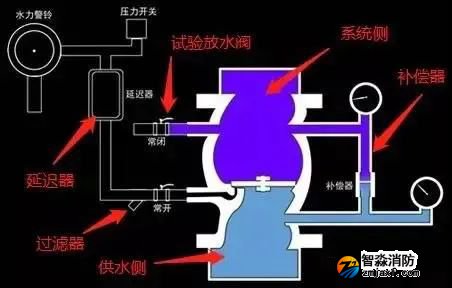 1、濕式報警閥結構中名稱如圖所示,相對來說比較簡單。其中延遲器和補償器都是防止管網(wǎng)內(nèi)水流波動導致閥組誤開啟的措施。試驗放水閥可以在閥組上開啟后,達到只開啟閥組而不用運轉(zhuǎn)整個系統(tǒng)來測試閥組的功能的作用。閥瓣伺應狀態(tài)下封閉住報警管路,當閥瓣開啟后,水流流入報警管路,充滿延遲器,觸動壓力開關、水力警鈴報警。