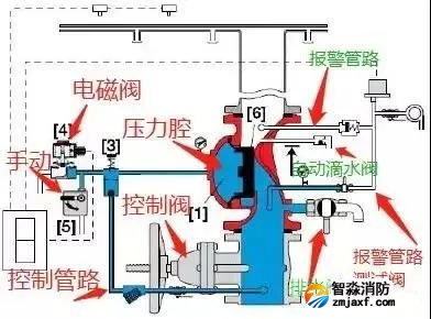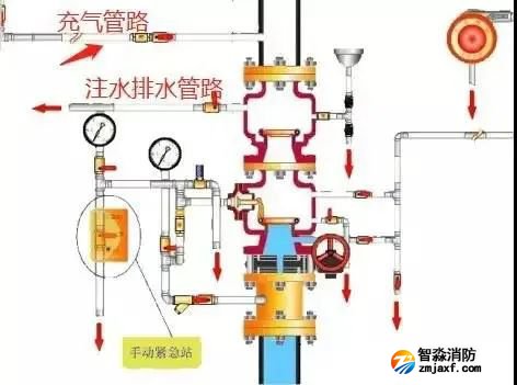 預作用閥組,從結構上是雨淋閥與濕式閥的組合。其管路以及功能上和濕式閥和雨淋閥的設置以及功能均相同。為什么預作用閥組上部一定要配一個濕式報警閥,主要原因是系統(tǒng)側(cè)充有有壓氣體,需要濕式報警閥來實現(xiàn)密封氣體。