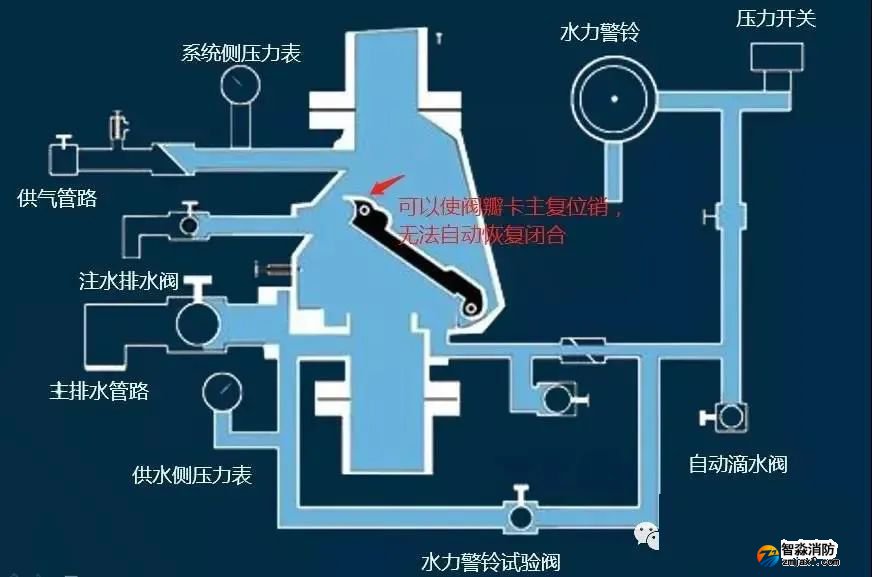 5)試驗結束或者火災撲救完之后,系統(tǒng)側(cè)的水全部從主排水管路排出(此時閥瓣仍是開啟狀態(tài),被復位銷卡住無法返回)。
