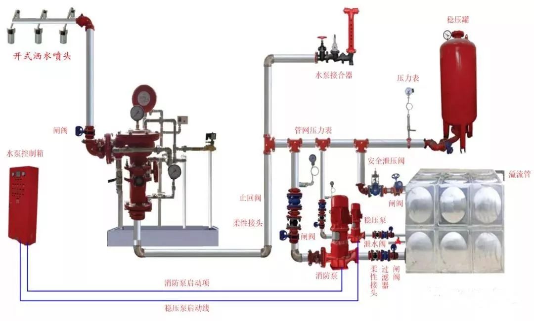 7、 雨淋系統(tǒng)由雨淋閥控制噴水范圍,由配套的火災(zāi)自動(dòng)報(bào)警系統(tǒng)或傳動(dòng)管系統(tǒng)啟動(dòng)雨淋閥,由開(kāi)式噴頭、雨淋閥組、水流報(bào)警裝置、供水設(shè)施及供水配水管道等組成。