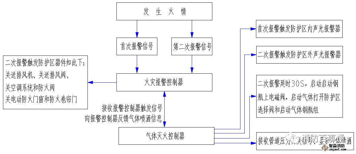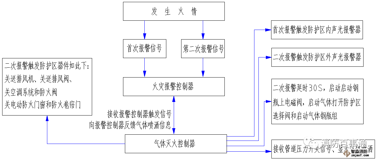 首先觸發信號防護區域內任一設置的感煙火災探測器作為首個聯動觸發信號后,火災報警控制器接收到第一報警信號,同時氣體滅火控制盤接到火災報警控制器的聯動請求,啟動設置在該防護區內的火災聲光警報器;再觸發感溫探測器或手動火災報警按鈕的報警信號,火災報警控制器接收到第二個報警信號,聯動該防護區內的相關設備如:停止排風機、關閉排風閥、關閉空調電源和送風管道上的防火閥,關閉防火門窗和降下防火卷簾門;同時氣體滅火控制盤接到火災報警控制器的第二次聯動請求,啟動設置在該防護區外的火災聲光警報器;延時30秒后,開啟氣體啟動鋼瓶上的電磁閥,啟動氣體通過傳動管開啟相關區域的選擇閥和打開對應的FM200鋼瓶組,氣體噴灑到該保護區域,氣體傳送管道上的壓力開關有回答信號,同樣保護區外的“放氣勿入”指示燈點亮;氣體釋放的信息反饋到火災報警控制器上。