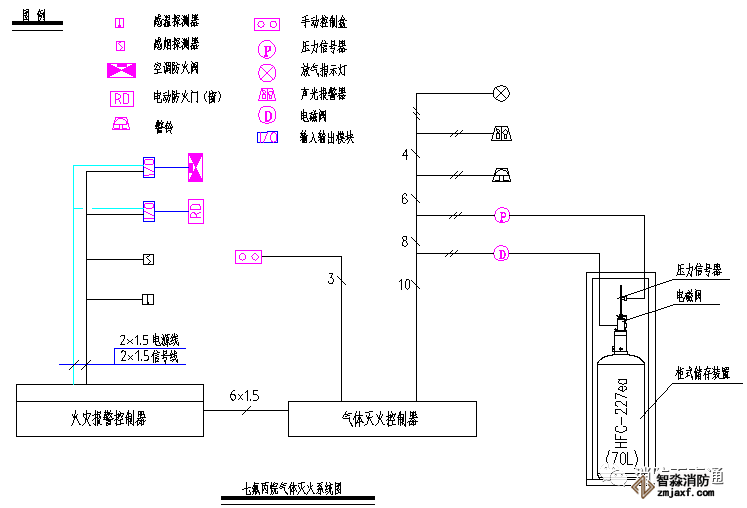 下面簡述一下該氣體滅火系統的組成方式,即參照《火災自動報警系統設計規范》GB50116-2013第4.4.3條,氣體滅火控制器、泡沫滅火控制器不直接連接火災探測器的組成方式,火災報警控制器設置在消防監控中心,防護區設置的感煙探測器和感溫探測器直接連接到消防控制中心的集中報警控制器上,消防控制中心的火災報警控制器通過總線控制模塊聯動切除空調系統和防火閥,關閉防火卷簾門等;氣體滅火控制器設置在防護區的鋼瓶組附近,連接防護區內的聲光報警器和防護區外的聲光報警器、以及啟動鋼瓶的電磁閥和氣體釋放的壓力開關信號機放氣指示門燈,現場緊急釋放和啟停按鈕設置在防護區門口。